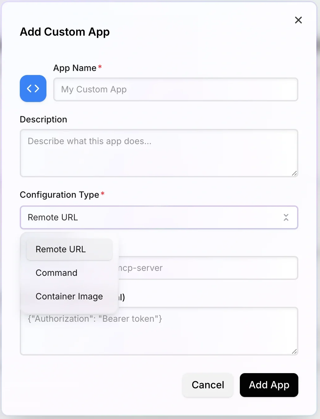 Note that you can also run any MCP server you wish in our platform, by adding a custom Python or Node package (uvx/npx) or a docker image, through clicking the first card in the homepage’s catalog.