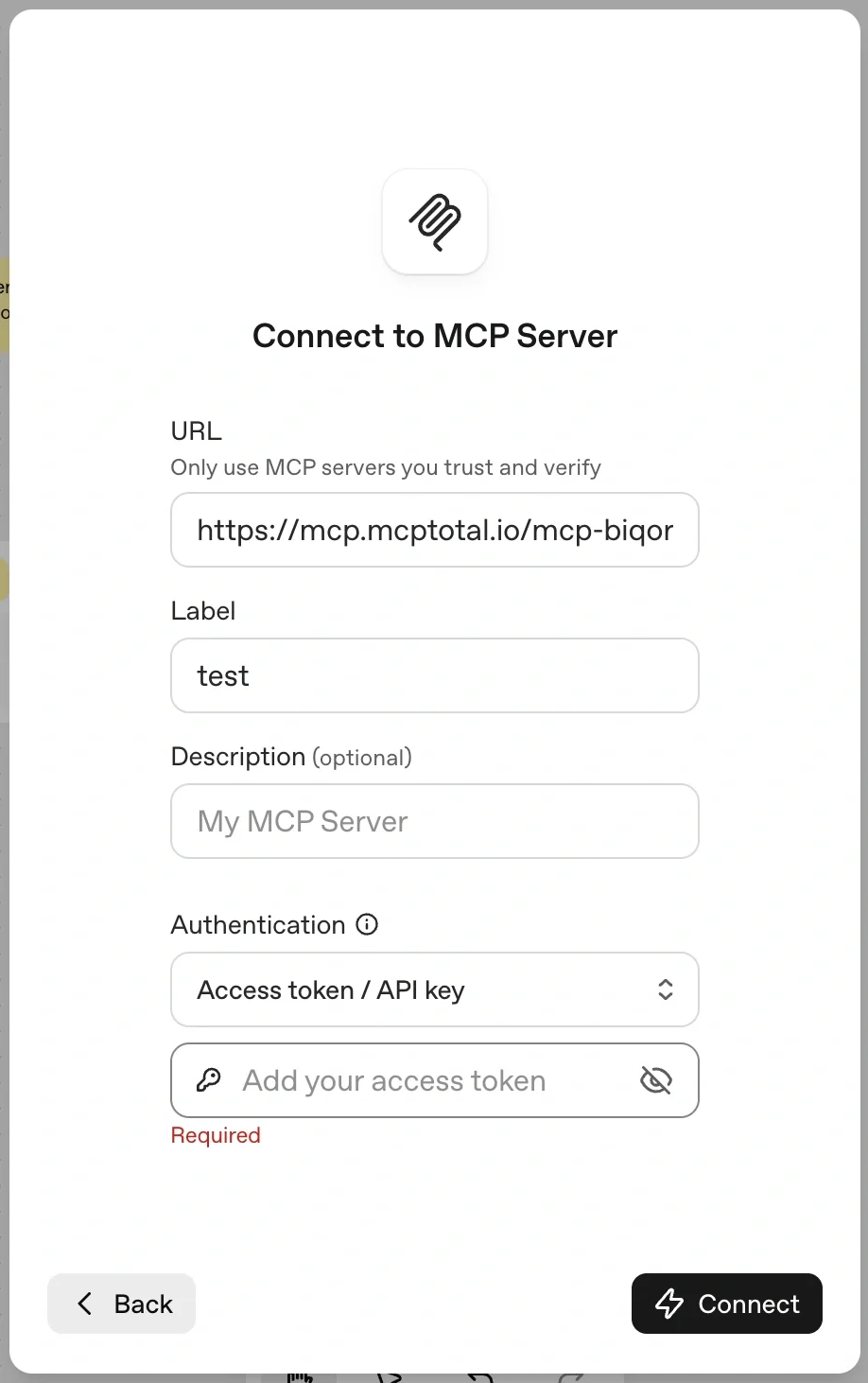MCPTotal simplifies the creation of an MCP server, enabling you to host various underlying tools (MCP servers) and securely expose them to OpenAI’s agent platform with appropriate URLs and credentials. We easily allow for running custom MCPs so you don't need to go through the hassle of deploying and managing them on your own.