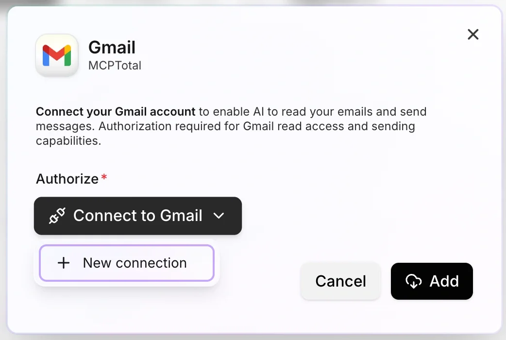 In this case we’re adding the ‘Gmail’ MCP server and authorizing it to use our inbox, so we can read and write emails: